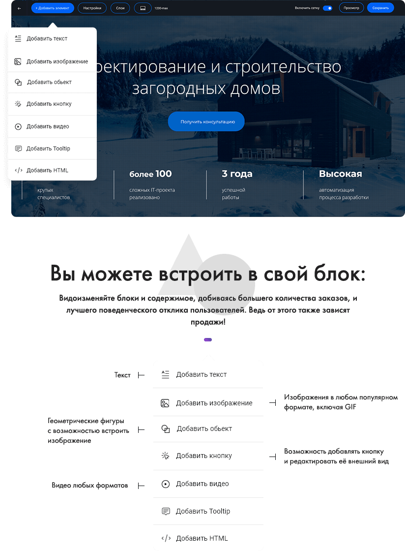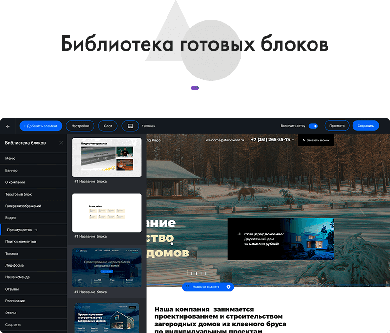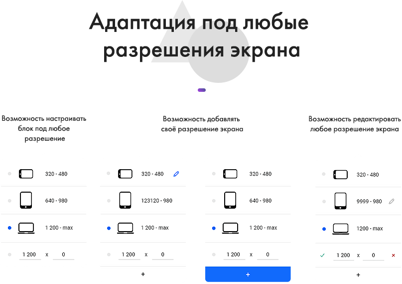 Блоки можно адаптировать под любые разрешения экрана. Создавая блок, вы оперируете не строками кода, а визуальными элементами. Загружайте и комбинируйте элементы, изменяйте их размеры, форму и положение в блоке. Накладывайте одни элементы на другие, определяя какой из них вывести на передний план. Настраивайте оси, отступы, размеры. Меняйте размер и расположение элементов перетаскиванием как в области редактирования, так и через настройки элементов. Все просто!