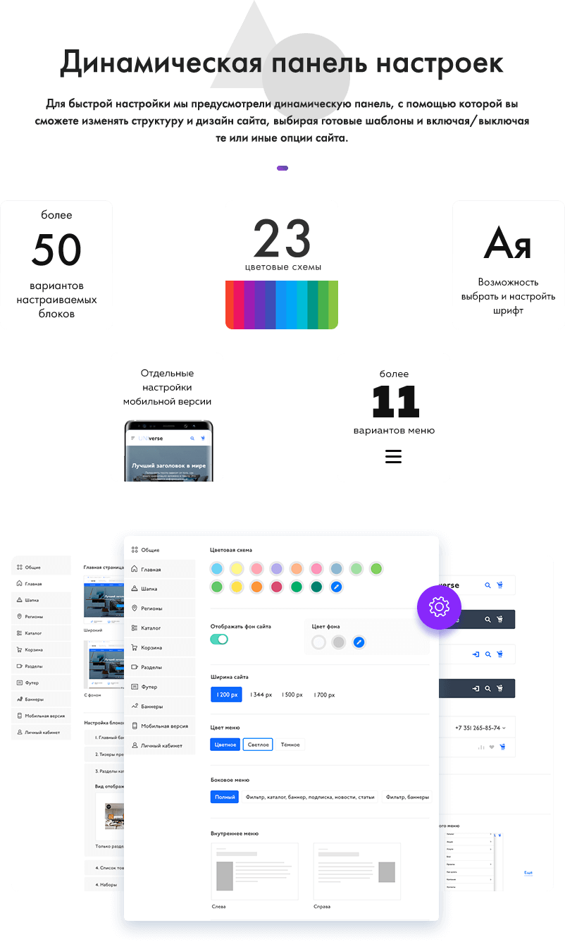 Динамическая панель настроек позволяет быстро и просто настраивать и персонализировать сайт под свои задачи - изменять структуру и дизайн, выбирая готовые шаблоны и включая или отключая нужные блоки, виджеты и элементы.