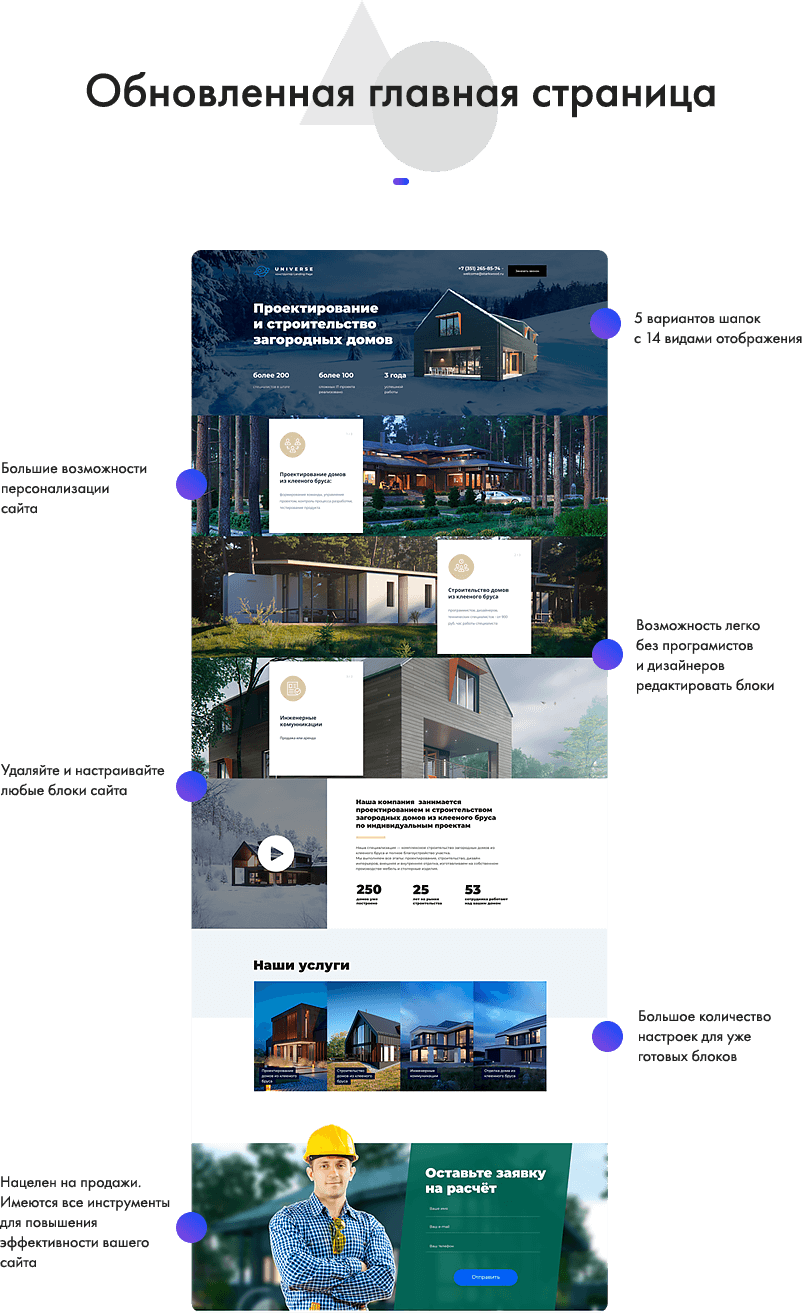 Ваш сайт должен быть еще более индивидуальным. Но как же добиться индивидуальности, имея стандартные шаблонные блоки? Именно это подтолкнуло нас к созданию конструктора блоков. Создавайте свои блоки и персонализируйте страницы сайта без дизайнера и верстальщика. Не нужно ждать добавления новых блоков от разработчиков или просить разработать блоки индивидуально, вы можете сделать это самостоятельно в 2 клика.