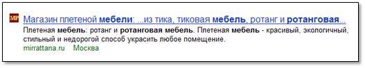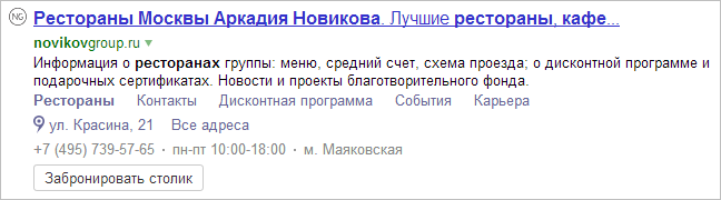 Также микроразметка влияет на отображение информации в сниппете (описании), который сопровождает ссылку на сайт в поисковой выдаче. Сниппет содержит более полное описание страницы: адреса, номера телефонов и так далее. Пример плохого спиппета: