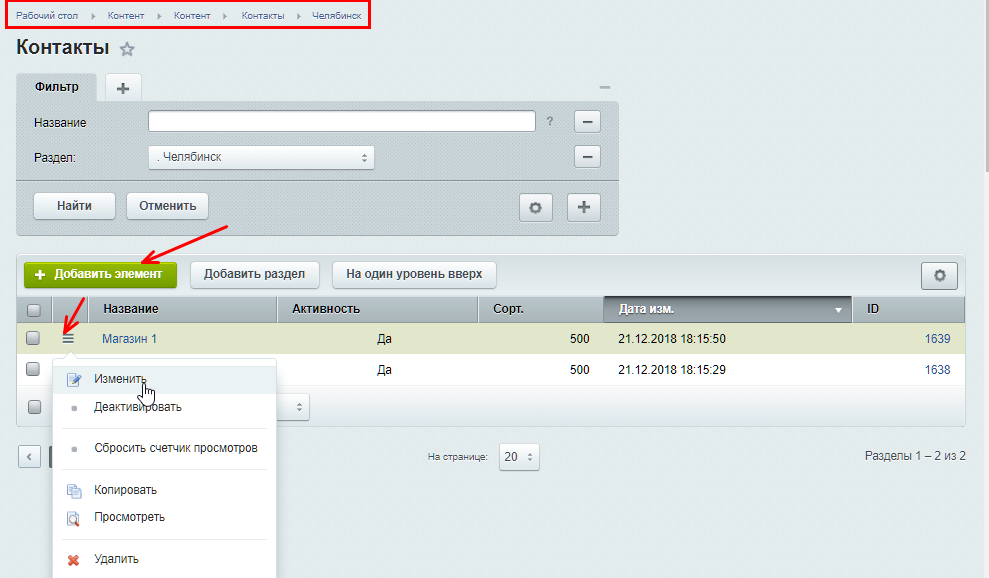 Для управления картой на линейке решений и перейдите в административную часть сайта в Контент → Контакты. Откройте папку региона, для которого требуется установить новое положение точек на карте. Чтобы изменить положение маркера уже существующего отделения, вызовите меню кнопки «Гамбургер» и выберите пункт «Изменить». Для создания новой точки на карте нажмите «Добавить элемент».