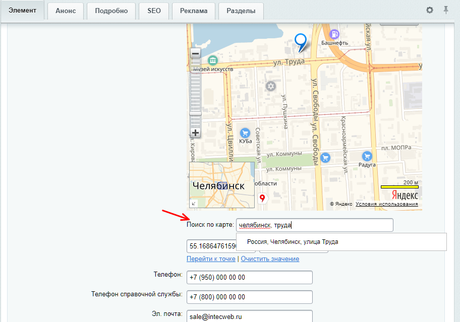 Управление маркером на карте производится на этой же вкладке. Для того, чтобы откорректировать положение уже установленного маркера, кликните по нему левой кнопкой мыши и, удерживая кнопку, перетащите на нужное место. Для установки новой точки воспользуйтесь поиском по карте. Введите полный адрес (с названием города), а на карте кликните дважды левой кнопкой мыши на изображении здания, где расположен филиал. Не забудьте сохранить изменения.