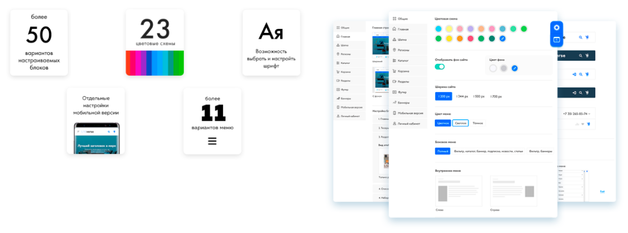 • Настройка шапки сайта, футера, хедера (более 10 готовых конфигураций);