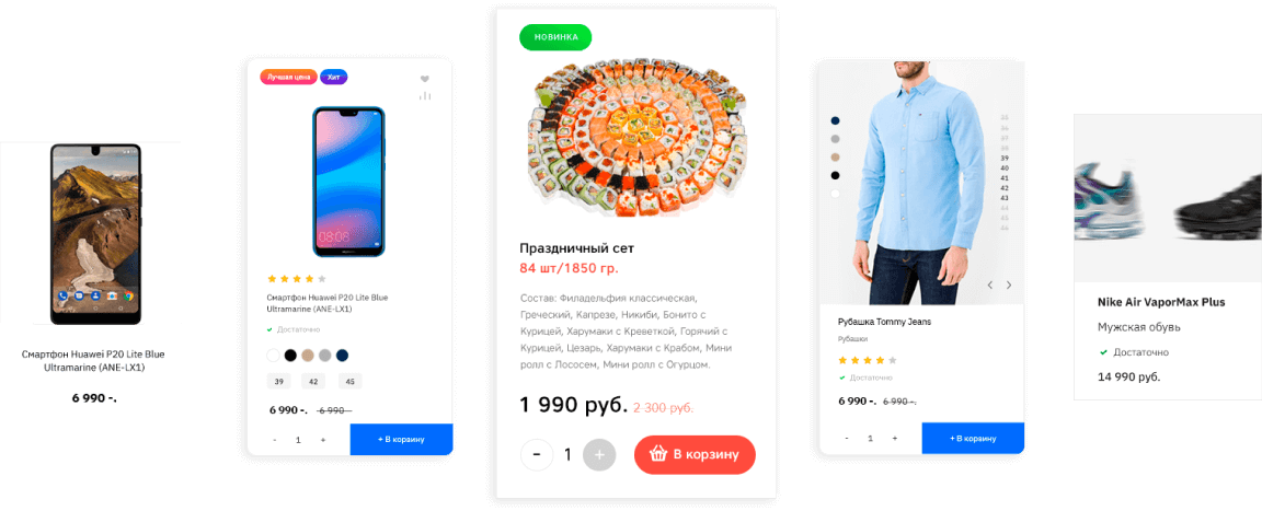 • Несколько типов товаров – карточка промышленных товаров, карточка одежды и потребительских товаров, карточка услуги, карточка объекта недвижимости;