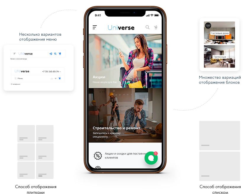 Обширные настройки мобильной версии позволяют адаптировать ваш сайт под любые задачи. Вы можете настраивать отображение мобильной версии сайта отдельно от основной, выбирать мобильные шаблоны виджетов, блоков и элементов сайта из нескольких вариантов.